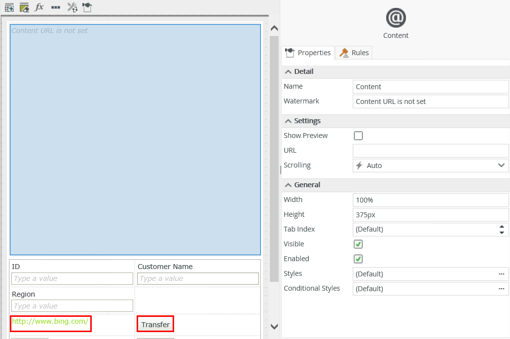 - Set a control’s properties or execute a control's method rule action: You can configure the settable properties of the control with this action, for example you can set the URL of the control using a Set control properties or Execute a control's method rule action. See the Setting the URL using a Rule section for more information.