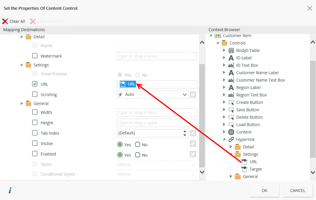 - When you configure the Set the Properties of Content Control action, drag the URL of the Hyperlink field from the Context Browser to the URL of the Content field in the Mapping Destinations section as shown below.