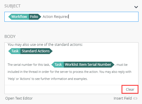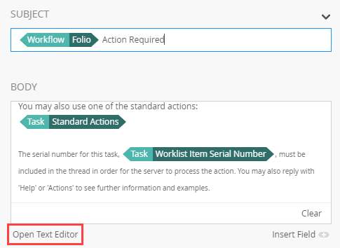 | Body | Customize the body of the notification. A standard email notification template is added by default, but you can create a custom message. As with the subject, you can create dynamic content using items from the Context Browser. You can click and drag items or click the Insert Field link.You can directly type a message into the body, or alternatively use the Text Editor to create formatted content. Using the Text Editor gives you access to formatting to specify things like font, font size, bold, italic and underline formatting, and text alignment. In the Text Editor, you can toggle between the rich-text editing mode and HTML editing mode by clicking the HTML button. You can copy content from a web page or Microsoft Office application and paste it into the Text Editor of the Body field. When you paste the content, it is stripped of all malicious or unsupported content which improves performance and the integrity of the platform. Using HTML mode