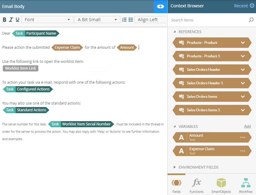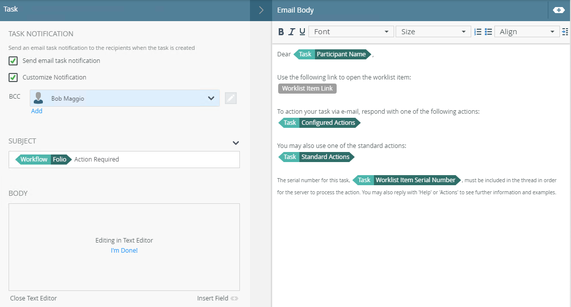 - Edit the body as necessary for the customized notification. You can use the text formatting tools such as Font, Font size, Bold, Italic, Underline and Align. You can use the Context Browser to drag fields and functions to define the email body.