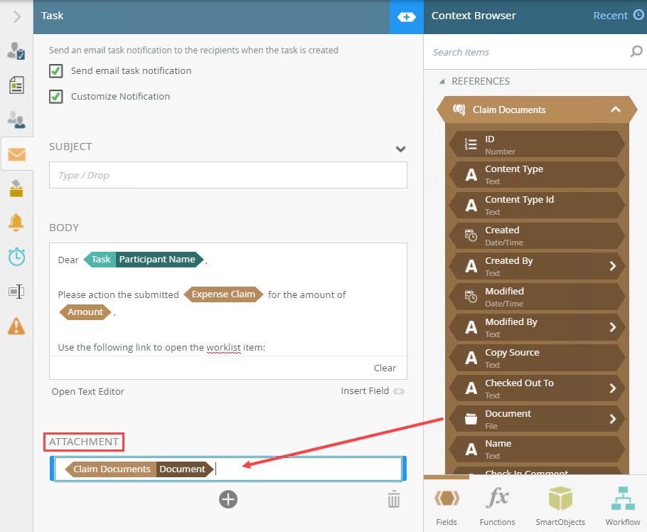 - You can use a reference, a function, or a SmartObject method that returns a file in the Attachment field. Click Add to add more attachments. To remove an attachment, select it and click the Trash bin. In this example, the original claim application document is attached to the email notification using a SharePoint library reference.