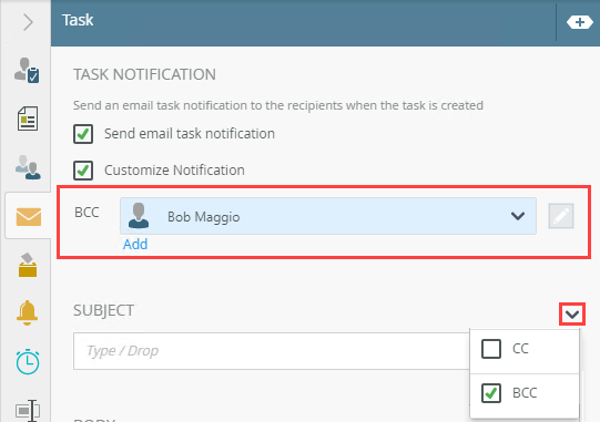 - Click the Subject menu. Use this to include , Cc, and Bcc recipients to the email notification.