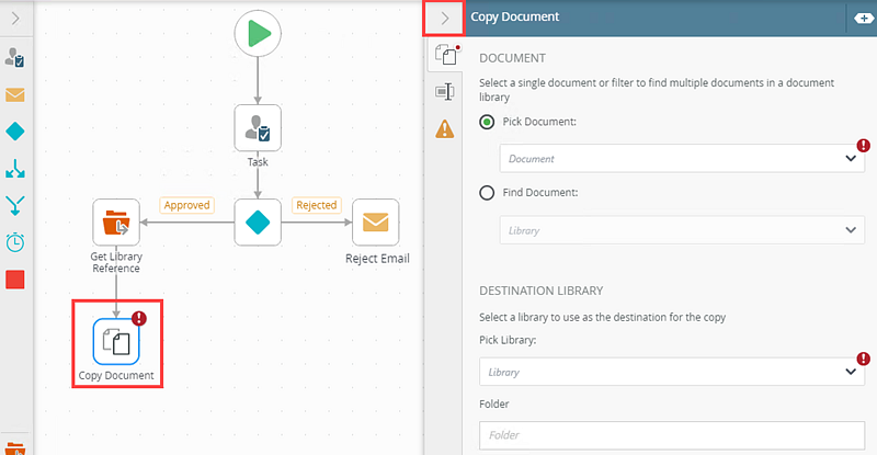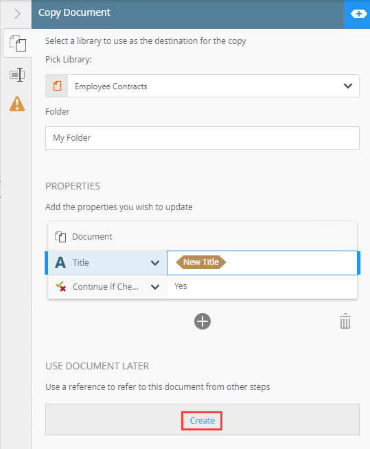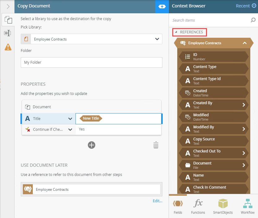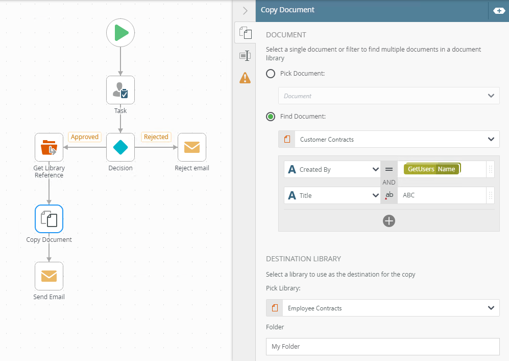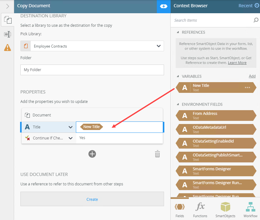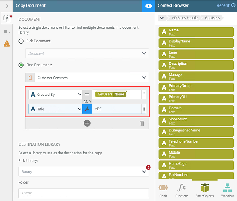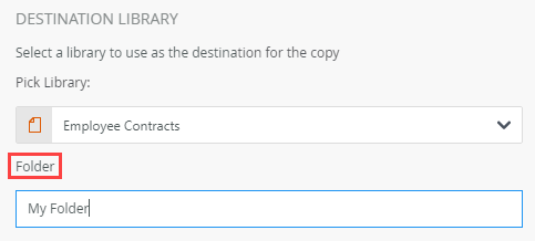 - Specify the folder, in the library, where the document is copied. Type values or create dynamic values by dragging Functions,