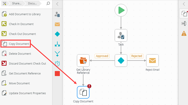 Use the Copy Document step to copy a document from and to a SharePoint library. You can, for example, use the Copy Document step in a business application where you want to create a copy of a document so that changes can be made without affecting the original document. Copying the document creates an independent version of the document.