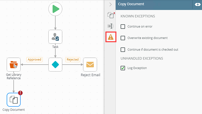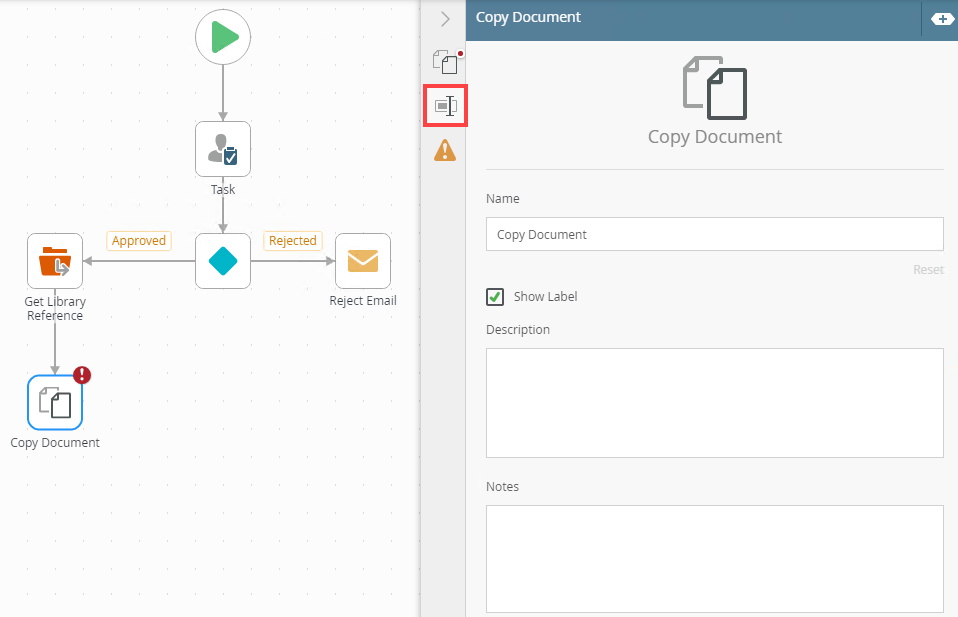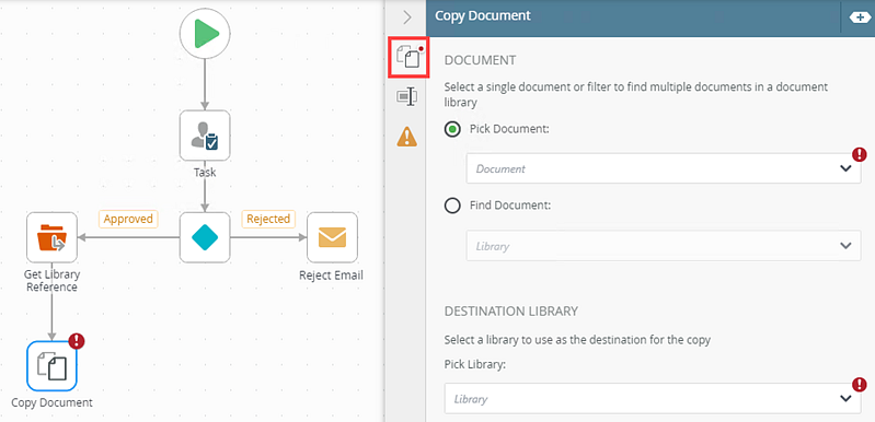 - Select the Copy Document tab. Use this tab to configure the step's properties.