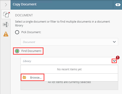 | Find Document | Use this to browse to the library containing the desired document. | Click the Find Document radio button to enable this option. Click the menu and select Browse to browse to a specific one. |