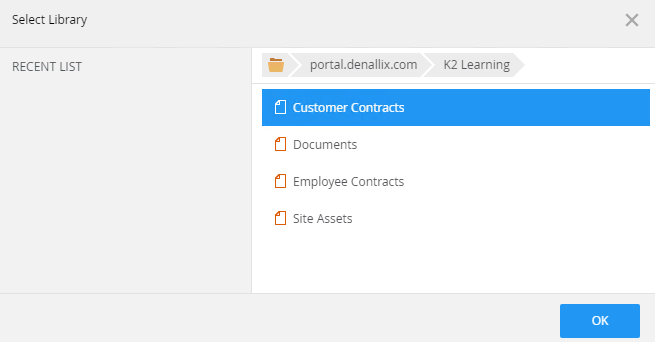 | Pick Library | Use this to pick a document library reference or browse to a library. The menu contains a list of document libraries. By default, this option is selected. | Select the Pick Library radio button to enable this option. Click the menu and select the name. |