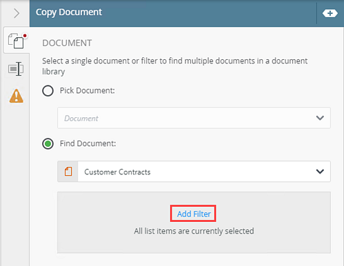 - From the Document section, select either Pick Document (select a referenced document from the menu) or Find Document (browse to the document). In this example, select Find Document. From the menu select Browse and navigate to a location of the document to copy.