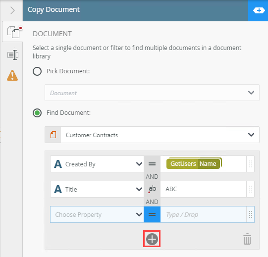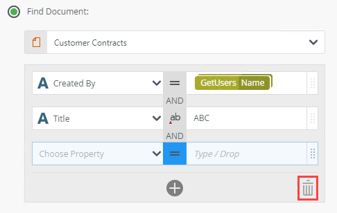 Applying filters is commonly used when the Find Document option is selected. - Select a property from the menu. Select an operator to define the filter. Type values or create dynamic values by dragging Functions,