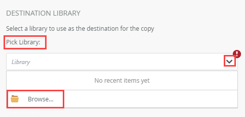 - From the Destination Library section, select a library to use as the destination for the copied document. Select a referenced library from the menu or browse to one using the Browse option. This selection is required.