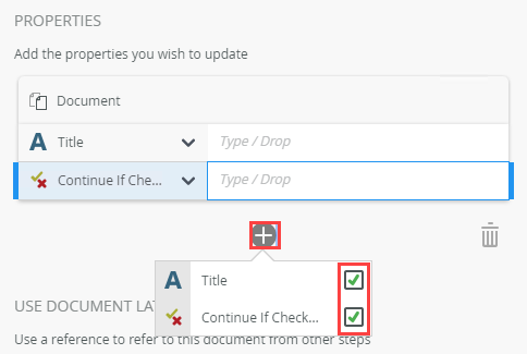 | Properties | Use this to set the filters to determine the document to be updated, and add field details to update the document with. Filter for specified values in one or more fields to identify the document. Type values or create dynamic values by dragging Functions, Fields, SmartObjects and Workflow-related items from the Context Browser into the fields. When a SmartObject load method property is used, an input property is required for the correct information to load. | Click Add to add a property. Click the menu to select the property. Type values or create dynamic values by dragging Functions, Fields, SmartObjects and Workflow-related items from the Context Browser into the fields. To delete properties, select them and click the Trash bin. |