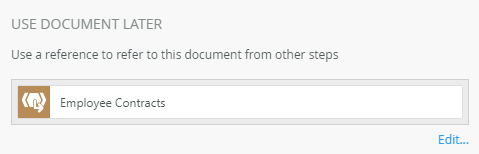 | Use Document Later | Use this option to create a reference to the document that can be used in other steps within the workflow. | Click the Create link to create a reference. Click the Edit link to edit the reference name. If you edited the reference name and want to reset it, click the Reset Name link. |