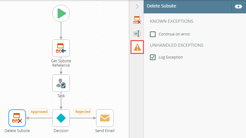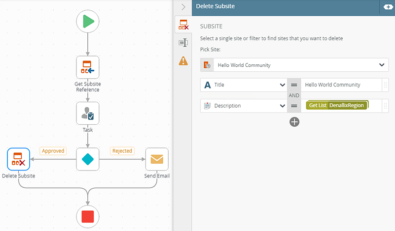 Example of a Delete Subsite step in a workflow