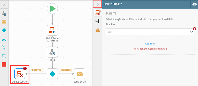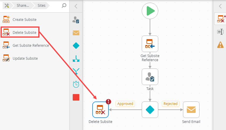 - From the Toolbox click the SharePoint category and then Sites. Drag the Delete Subsite step onto the canvas.