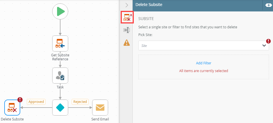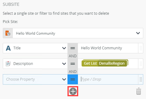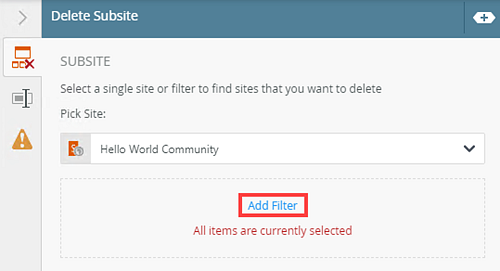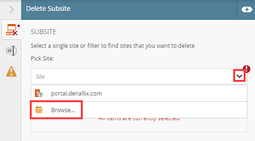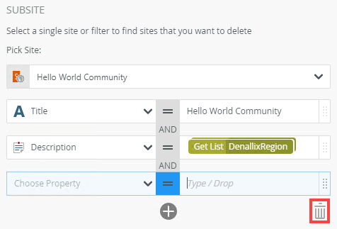 Use the Delete Subsite step to delete a SharePoint site that you no longer need.