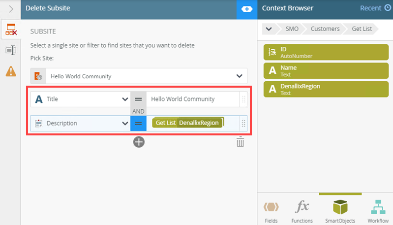 | Filters | The filter allows you to specify parameters and filters to return data. Applying filters is optional. Use operators such as Equal, Not Equal, Starts With, Ends With, and Contains. Parameters are sometimes required - it depends on the SmartObject method selected. If the method has parameters, you probably need to provide values for those parameters to execute the method. The red text in the Filter section serves as a warning. Unless you add a specific filter, all subsites on the selected site (Pick Site menu) will be deleted. Example: You have three subsites on the portal.denallix.com site and you want to delete one of them (K2 Learning). Use the Title property to configure a filter to delete a specific subsite from the selected site.