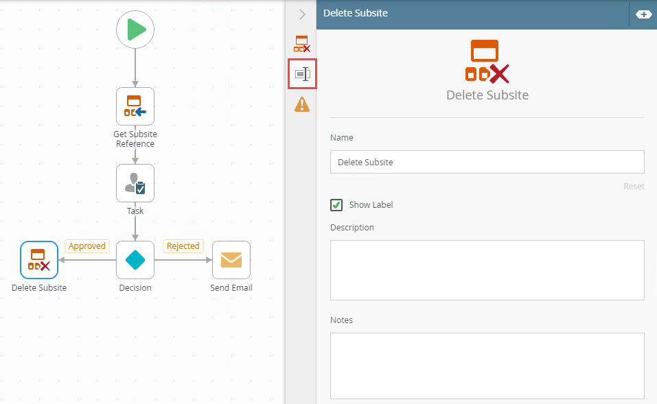 - Select the Delete Subsite tab. Use this tab to configure the properties.