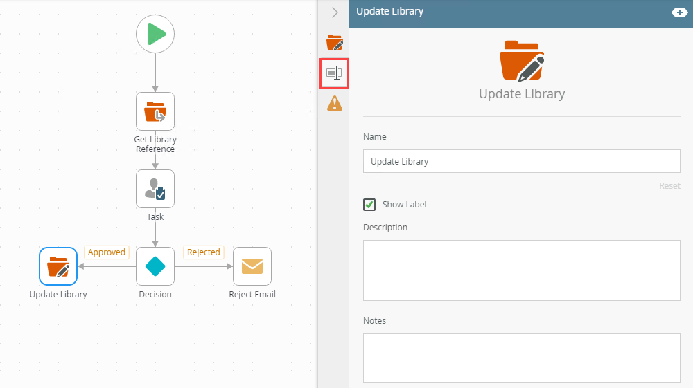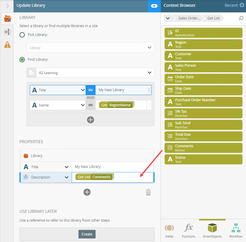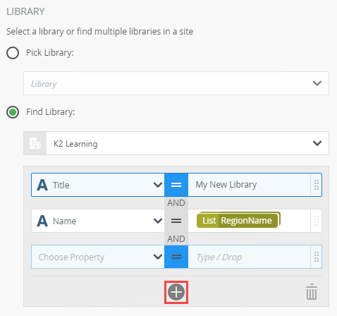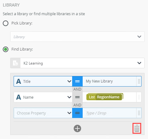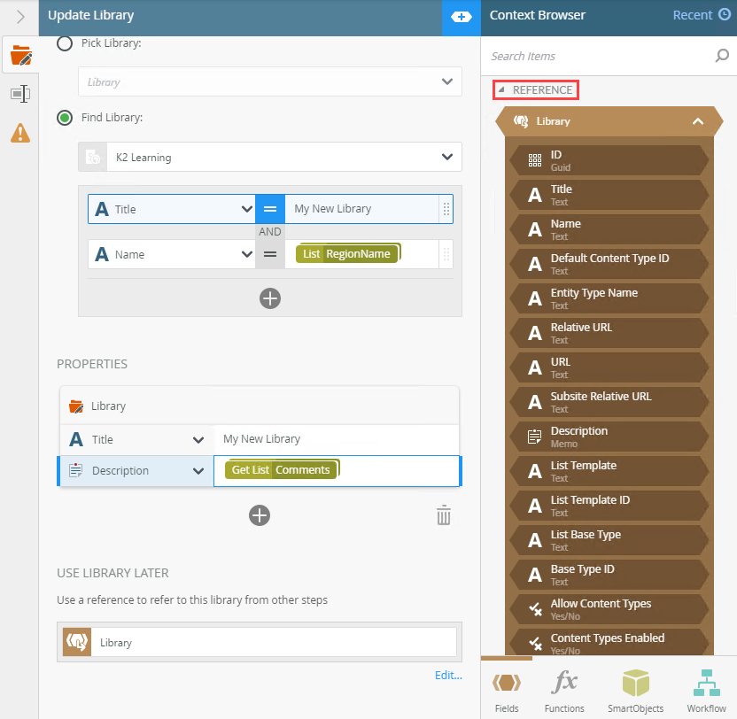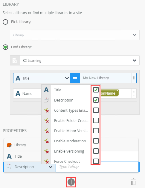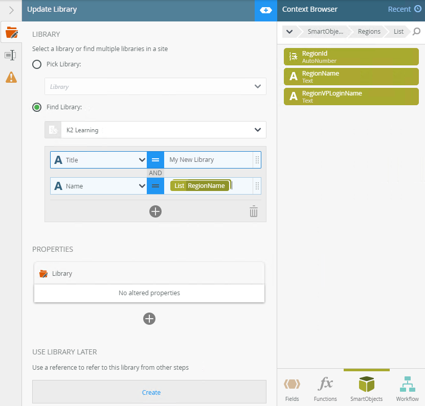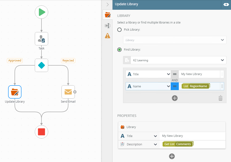 | Properties | Use this to set the filters to select the library to be updated. Filter for specified values in one or more fields to identify the library. Type values or create dynamic values by dragging Functions, Fields, SmartObjects and Workflow-related items from the Context Browser into the fields. When a SmartObject load method property is used, an input property is required for the correct information to load. | Click the Name field to add a name by typing or dragging a value. Click Add to add the Description field. To delete properties, select them and click the Trash bin. |