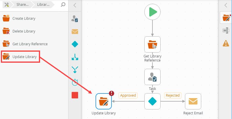 - From the Toolbox click the SharePoint category, the Libraries category and then drag the Update Library step onto the canvas.