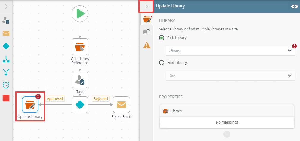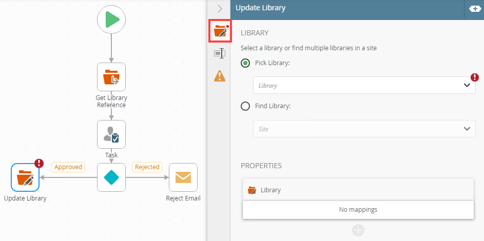 Use the Update Library step to update a SharePoint library. You can, for example, use the Update Library step in a workflow to change the title or description of a library based on a decision or event.