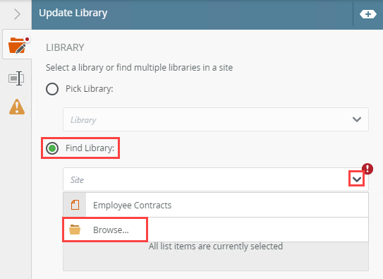 - From the Library section select either Pick Library (select a referenced library from the menu) or Find Library (browse to the site). In this example, select Find Library. From the menu select Browse and navigate to a location of the library.