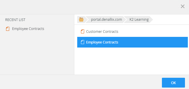 | Pick Library | Use this to pick a document library reference. The menu contains a list of document libraries. If you don't see items in the menu, you need to create a SharePoint referenced item using a SharePoint reference step within the workflow. | Select the Pick Library radio button to enable this option. Click the menu and select the reference name. |