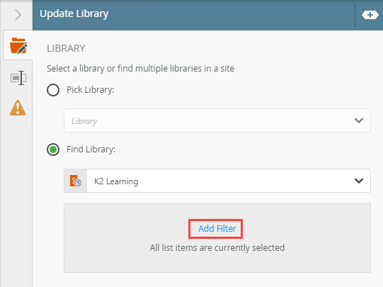 - Select the library, click the Add Filter link to filter for values in one or more fields to identify the library.