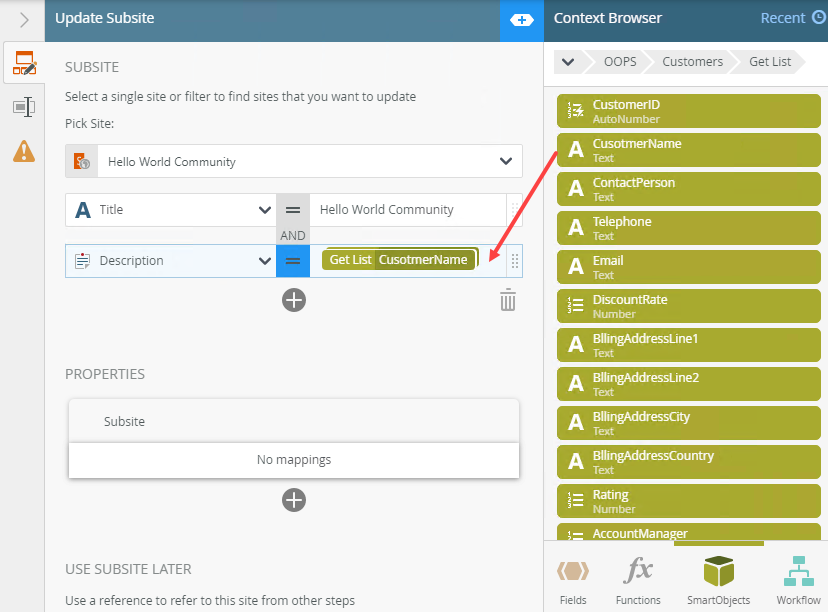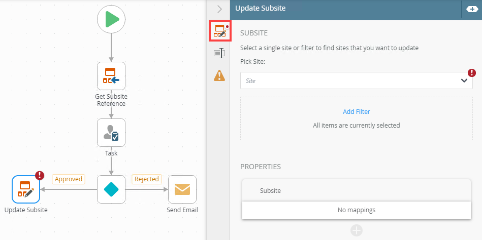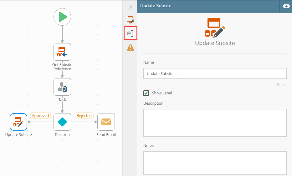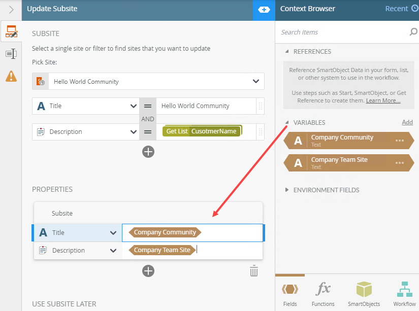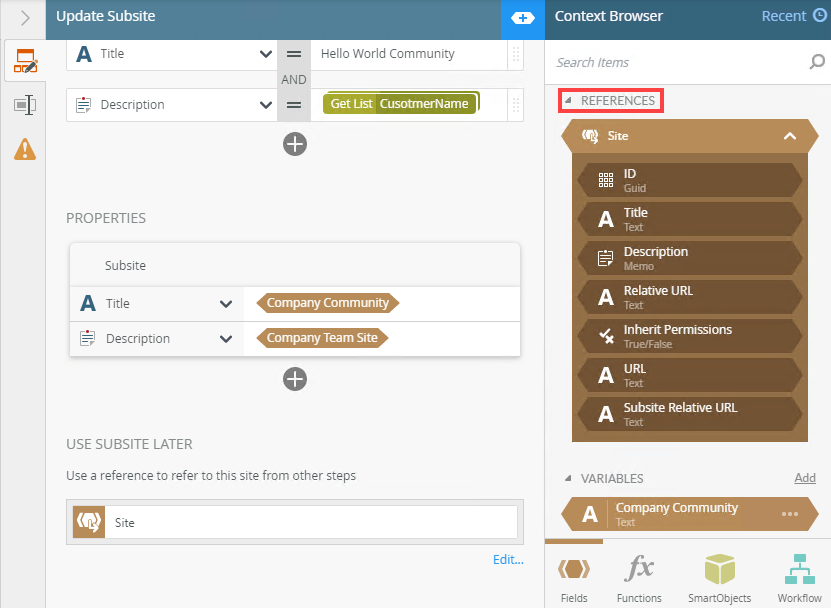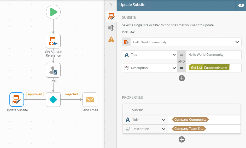 Use the Update Subsite step to update a SharePoint site. You can use the Update Subsite step, for instance, to update a site name or description based values entered on a form or retrieved from a SmartObject.