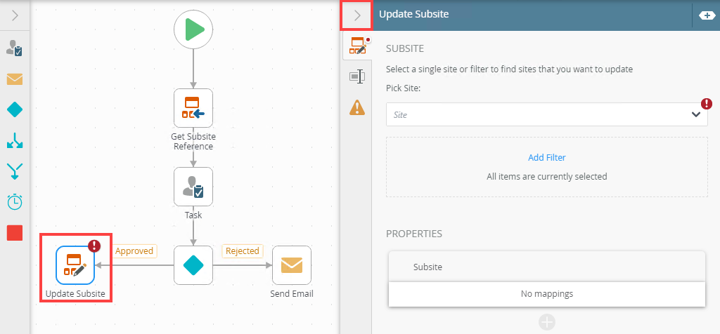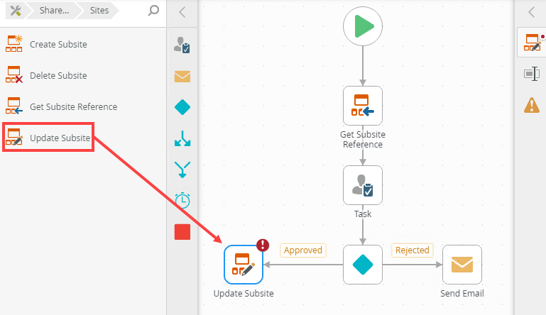 - From the Toolbox, click the SharePoint category and then Sites. Drag the Update Subsite step onto the canvas.