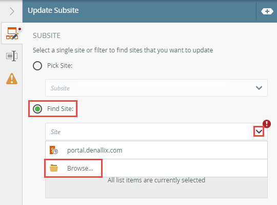 | Pick Site | Use this to select a previously created subsite reference, a previously used site or to browse to the specific subsite. | Click the menu and select the reference name. Click the menu and select Browse to browse to a specific one. |