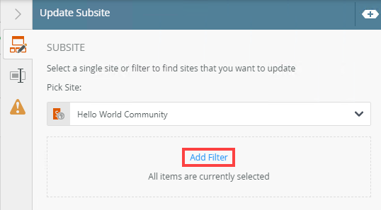 - Select the site, click the Add Filter link to filter for values in one or more fields to identify the site.