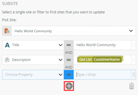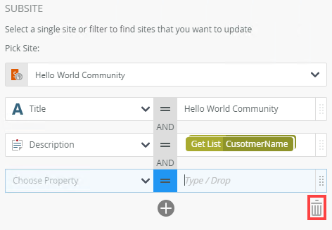 | Properties | Use this to set the filters to select the site to be updated. Filter for specified values in one or more fields to identify the site. Type values or create dynamic values by dragging Functions, Fields, SmartObjects and Workflow-related items from the Context Browser into the fields. When a SmartObject load method property is used, an input property is required for the correct information to load. | Click the Name field to add a name by typing or dragging a value. Click Add to add the Description field. To delete properties, select them and click the Trash bin. |