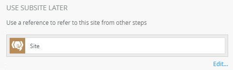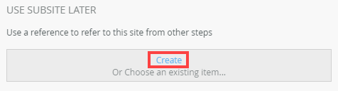 | Use Subsite Later | Allows you to create a reference to the subsite to use from other steps within the workflow. | Click the Create link to create a reference. Click the Edit link to edit the reference name. If you edited the reference name and want to reset it, click the Reset Name link. |