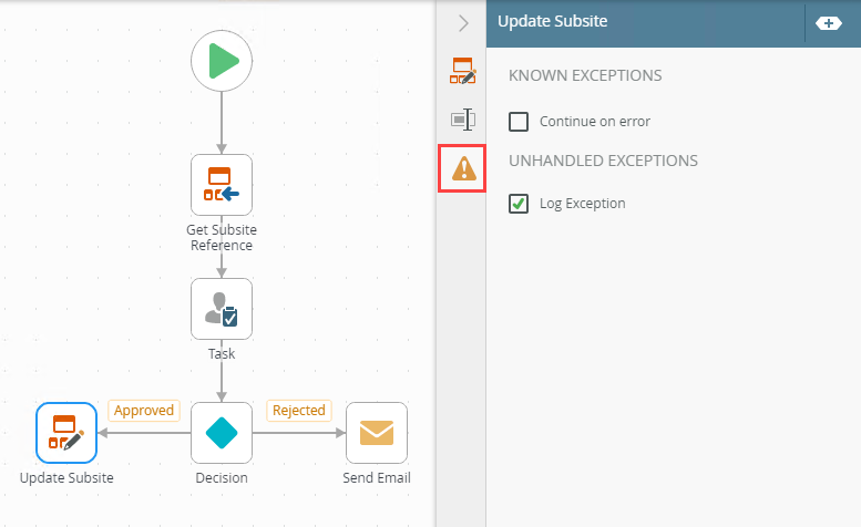 | Log Exception | Logs the exception to the error log. |