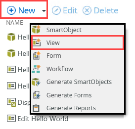In this step, you create a new list view from the Hello World SmartObject. This view displays all the records in your Hello World list. In a later step, you add this view to the Hello World form so that you can view a list of Hello World items. This step demonstrates how you can display SmartObject data in a view.