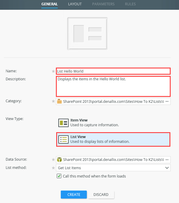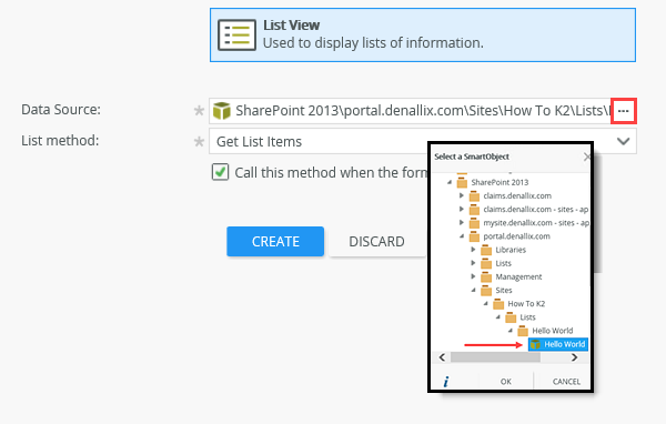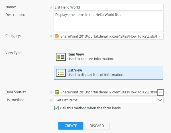Note: your values may be different but it should already be set correctly for your environment by default.Type List View Data Source SharePoint 2013\[Your Root Site]\Sites\[YourSite]\lists\Hello Worldlist Method Get List Items - From the K2 Application elements page, click New, then select View.