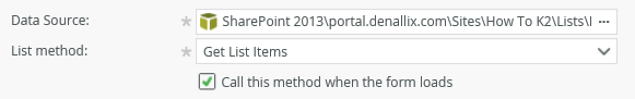 Now that you have set the data source, K2 selects the default method (Get List Items). The Call this method when the form loads option means that K2 retrieves all the list items from the Hello World list and displays them when the form loads. If you want to filter the list items, you can uncheck this box, then configure a rule to retrieve the list items based on a filter.