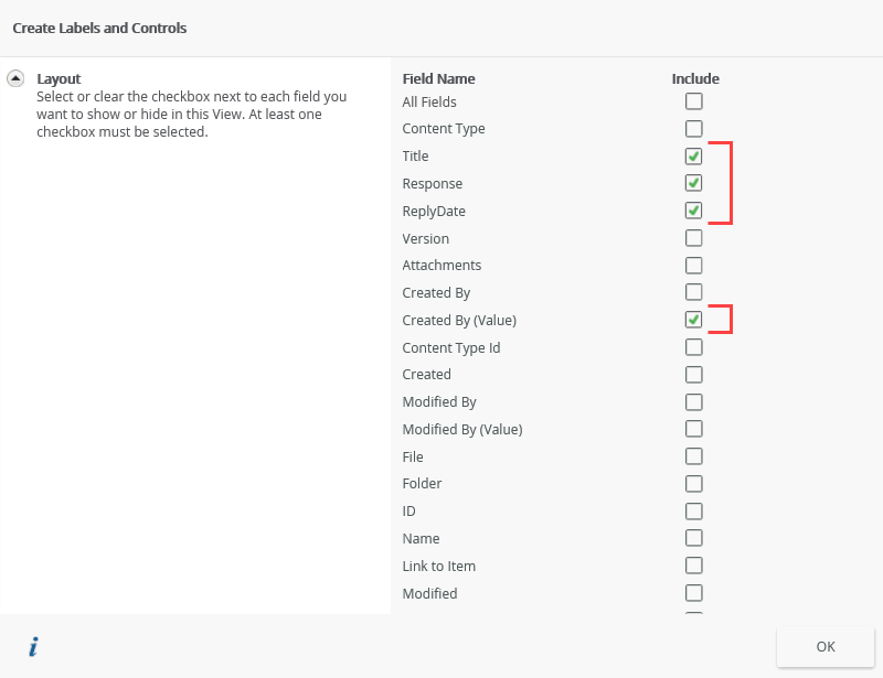 - On the Create Labels and Controls screen, select the fields you want to display on the view, then click OK. (There are no other edits to this screen.)