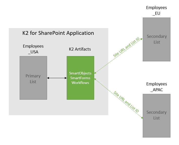 - You can use the SmartObject of the primary list in another SmartForm or workflow and configure the SmartObject reuse options to point to the secondary lists, Employees_EU and Employees_APAC.