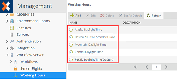 - You can define working hours on your environment to store the working hours for your organization, or to create different zones for different departments and offices in the organization. To configure them, click the working hours link. You must have access and admin permissions in Management to set the working hours. For more information on how to set your working hours see Work Hours. In this example, five different working hours are available in your organization.