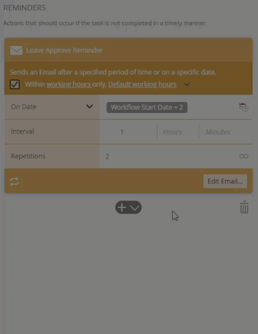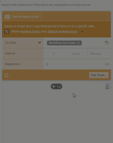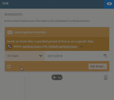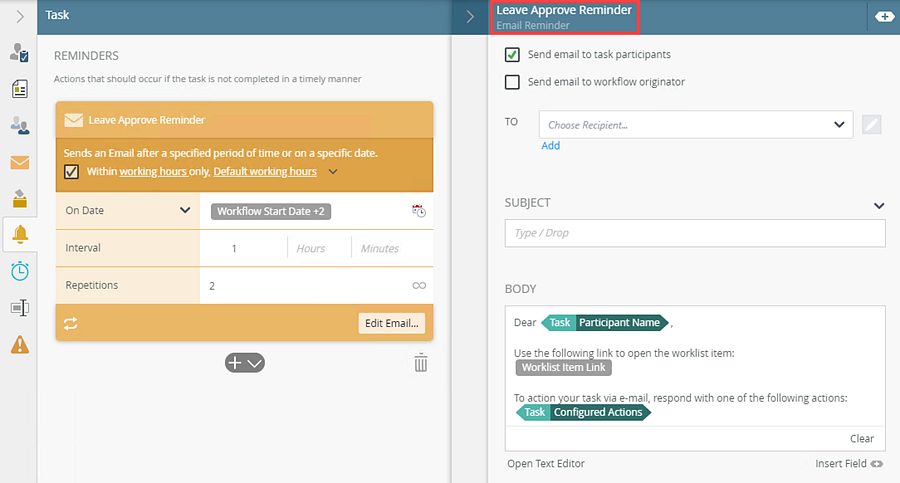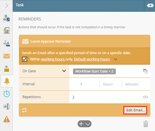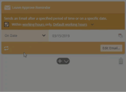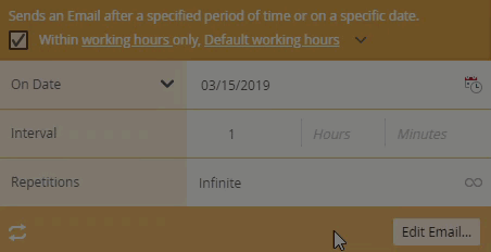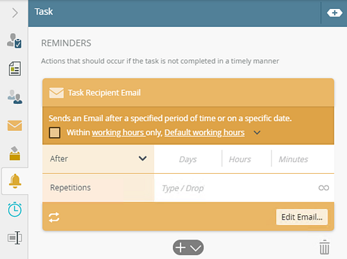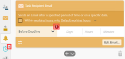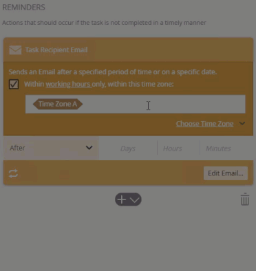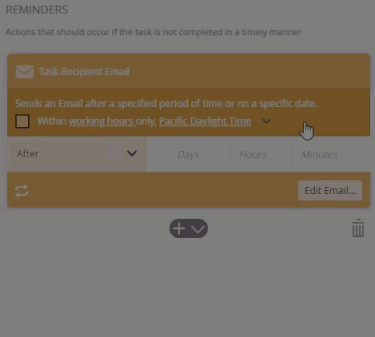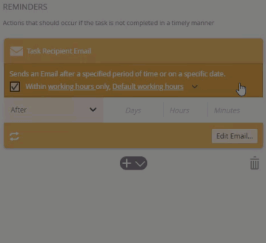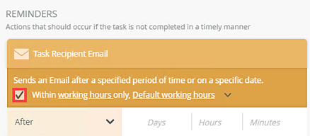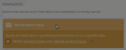Click the Task Recipient Email title to edit it. Within Working Hours Only Within working hours only allows you to set the reminder to take the specified working hours into account when calculating when the reminder should occur. This function applies when either the On Date or After option is selected. If you select one of these options, the reminder will execute on a specific date or after the set time, but take working hours into consideration. If you don't select the Within Working Hours only option, the reminder does not take working hours into consideration (so in some cases, the reminder actions could occur sooner, which may not be when people are in the office).