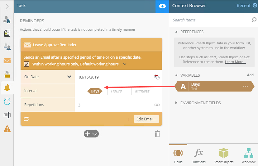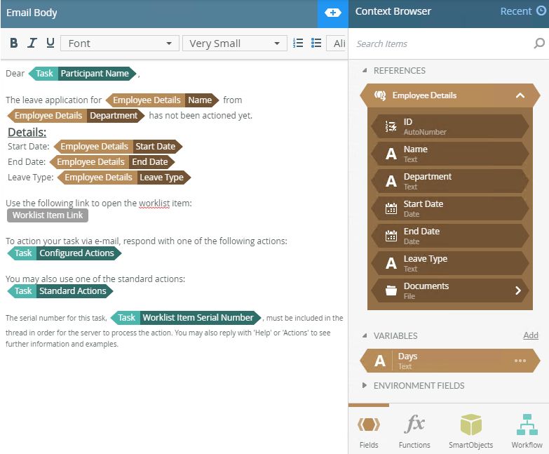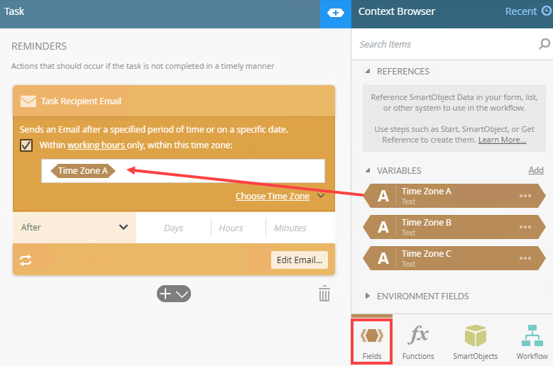 Type values or create dynamic values by dragging Functions, Fields, SmartObjects and Workflow-related items from the Context Browser into the fields.