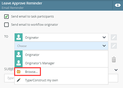To select a recipient click the To menu. By default, the workflow originator is selected. Other options in this menu include Originator's Manager, Browse, and Type/Construct my own.