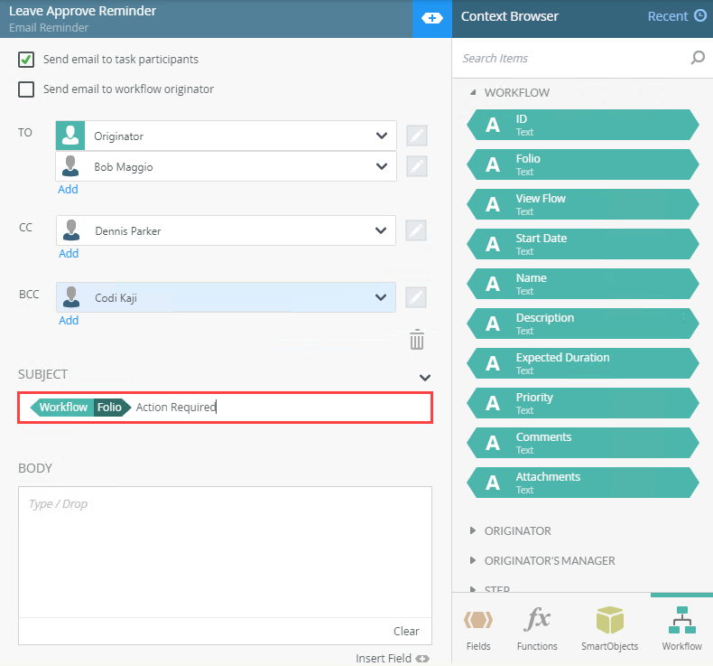 - Click the Subject field and type a value, use inline functions, or use dynamic fields by clicking the expand or collapse toggle to expand the Context Browser. Within the Context Browser, select inline functions from the Functions, Fields, SmartObjects or the Workflow categories to define your function. Click and drag the function on to the field.