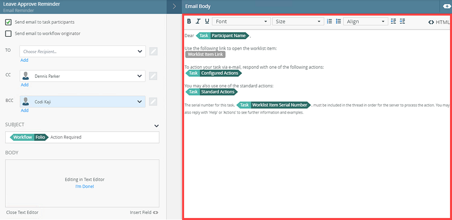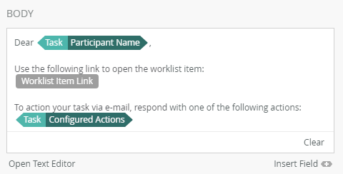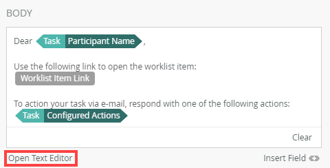 Customize the body of the notification. A standard email notification template is added by default, but you can create a custom message. As with the subject, you can create dynamic content using items from the Context Browser. You can click and drag items or click the Insert Field link.You can directly type a message into the body, or alternatively use the Text Editor to create formatted content. Using the Text Editor gives you access to formatting to specify things like font, font size, bold, italic and underline formatting, and text alignment. In the Text Editor, you can toggle between the rich-text editing mode and HTML editing mode by clicking the HTML button. You can copy content from a web page or Microsoft Office application and paste it into the Text Editor of the Body field. When you paste the content, it is stripped of all malicious or unsupported content which improves performance and the integrity of the platform. Using HTML mode