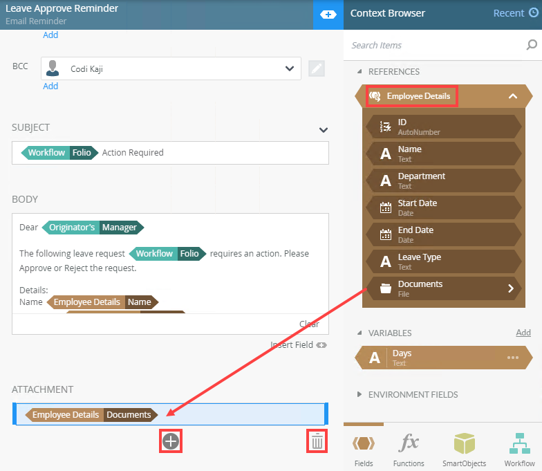 - You can use a reference, a function, or a SmartObject method that returns a file in the Attachment field. Click Add to add more attachments. To remove an attachment, select it and click the Trash bin. In this example a document, such as a sick note, is attached to the email notification using an Employee Details reference.