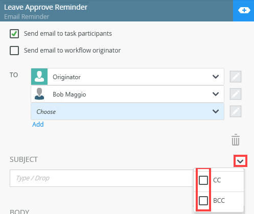Click the menu icon next to the Subject label to include Cc and/or Bcc recipients for the task reminder email. |