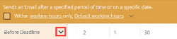 The Within working hours option does not apply when you select the Before Deadline option. When you configure the task reminder to send an email to someone else before the deadline, Work Hours are not taken into consideration. If your company's working hours are, for example, Monday through Friday, 8 am - 5 pm, and the task reminder is due outside of those hours, the reminder is sent at that time and does not wait until the next working hour.