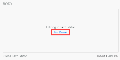 The We can't render this HTML in Rich text view message shows when you use an unsafe tag or attribute in your HTML text configuration. - Click the I'm Done link to collapse the panel when you're finished editing the body.