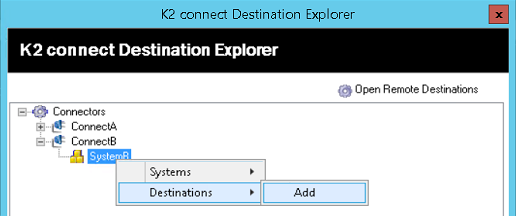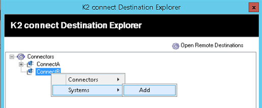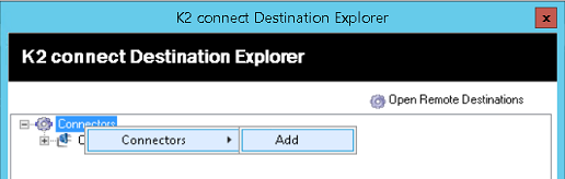 - From the K2 connect Destination Explorer, right click on Connectors and select Connectors > Add.